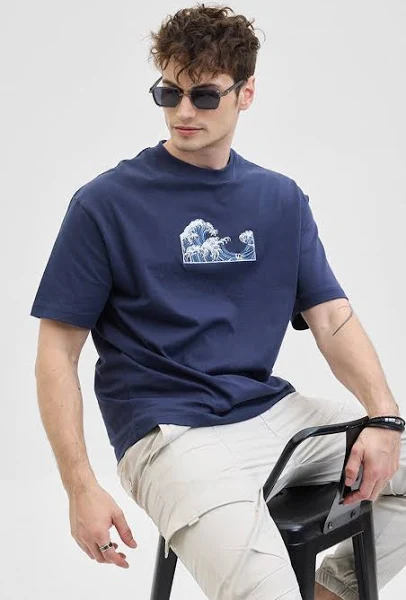 Snitch Men’s Waves Navy Printed Oversized T-Shirt